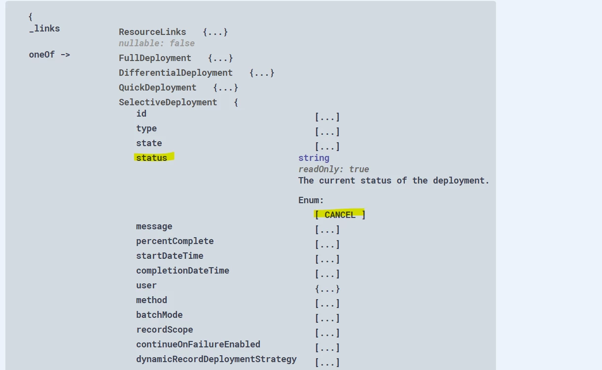 I am creating an issue for you -- I believe this is a defect in the swagger docs. In the mean time and in general, for each resource type, it is possible to get the list of order-able and filter-able fields, along with valid comparators and values programmatically via the API. For example, for deployments: